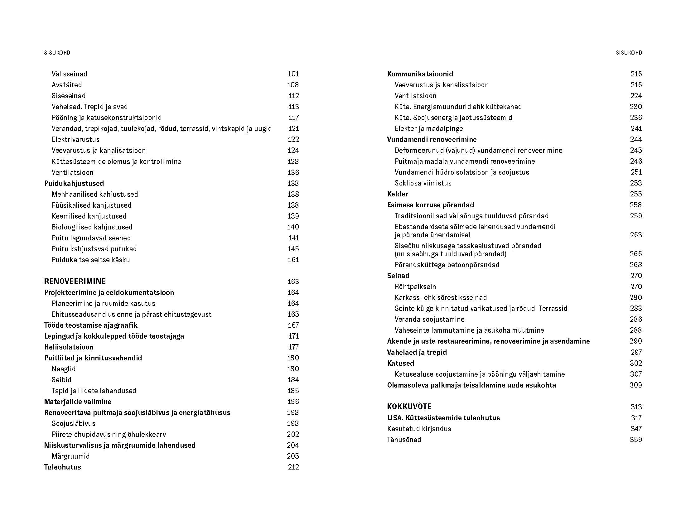 Kõigis peatükkides on põhi rõhk vundamentide ja esimese korruse seinte ning põrandate renoveerimisel, sest sotsiaalmeediast saadud tagasiside näitas, et just need on vana puitmaja renoveerimisel kõige kriitilisemad piirkonnad.